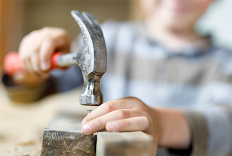 An gewerkstypischen Arbeitsstationen wird mit professionellem Werkzeug gebohrt, geschraubt, gelötet und gehämmert.